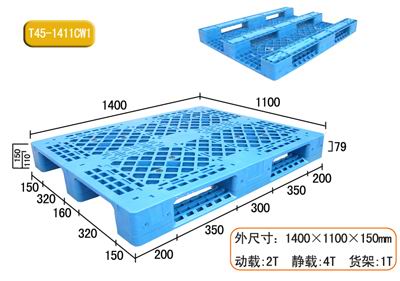 產品型號: HD-1411cw1 產品貨號: T45川字型塑料托盤 產品外尺寸: 1400×1100×150mm 產品內尺寸: 產品結構: 單面網格川字底型 產品內容量(L): 承重量(T): 動載2T,靜載4T,貨架載1T 產品認可標準: ISO9001:2000質量體系認證