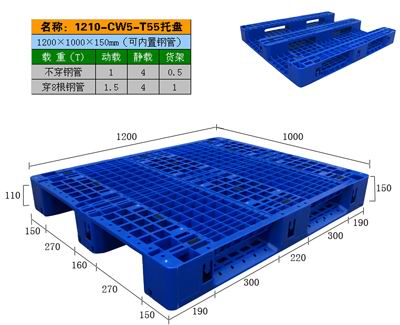 產品型號 HD-1210CW5 產品名稱 T55 產品外尺寸(mm) 1200*1000*150 產品結構 單面網格川字型(可內置鋼管) 承載量 動載1.5噸,靜載4噸,貨架1噸 產品認可標準 ISO9001:2000質量體系認證 此款塑料托盤上表面可內置4根鋼管,川字底部內置4根鋼管,貨架上的載重量大,適合平地墊倉,在貨架上和